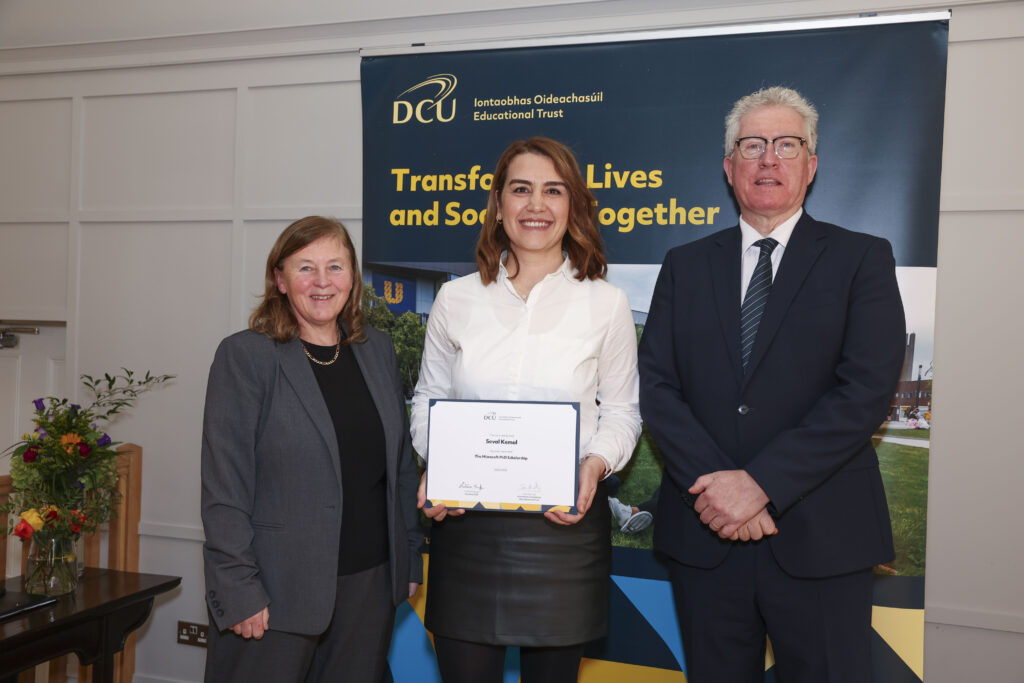 Seval Kemal is presented with her scholarship by Deirdre Hannigan, Chair of DCU Educational Trust and Prof Dáire Keogh, President of DCU.
